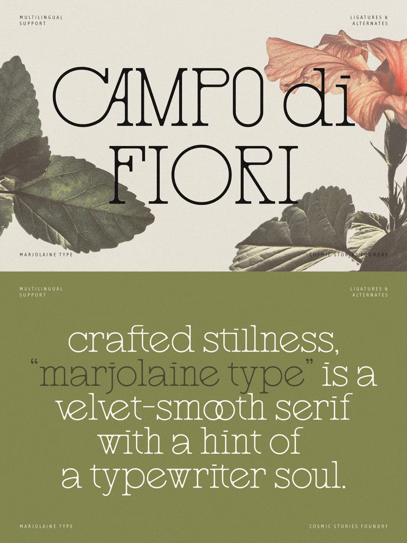 marjolaine sits between a delicate slab and a typewriter style — elegant proportions with just enough mechanical edge to keep it interesting. sophisticated and full of personality. the kind of font that has charm, attitude, and knows exactly how good it looks.